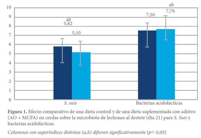En este estudio se observó que la intervención nutricional en la dieta de cerdas con AO + MCFA antes del parto y a lo largo de la lactación disminuyó los recuentos de S. suis e incrementó el recuento de Lactobacilus spp en las muestras de heces de lechones de cerdas tratadas, lo que indicaba una menor transmisión vertical en una granja comercial con reconocidos problemas por esta enfermedad (figura 1).