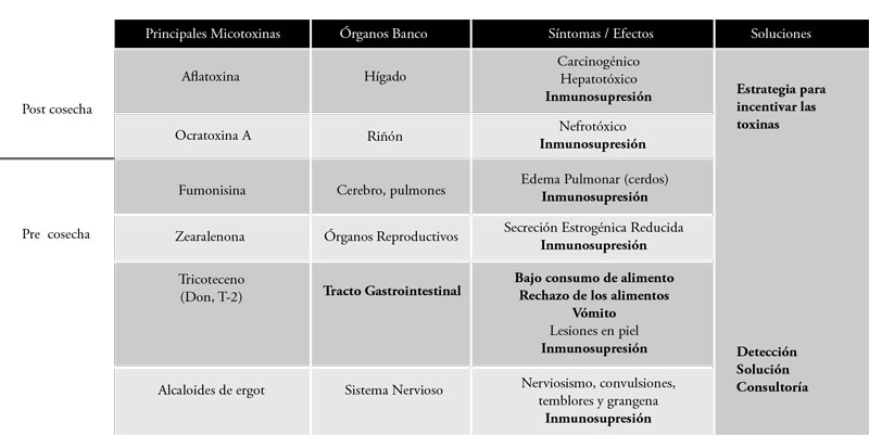 Además de una disminución en las ganancias, las micotoxinas tóxicas incluso en pequeñas cantidades pueden debilitar el sistema inmunológico y promover enfermedades infecciosas. Incluso bajas concentraciones de dos micotoxinas concurrentes pueden resultar en efectos sinérgicos exponenciales, lo que lleva a un mayor impacto en el animal de lo inicialmente esperado. La presencia de varias micotoxinas en una sola materia prima se debe a que un hongo puede producir más de una micotoxina.