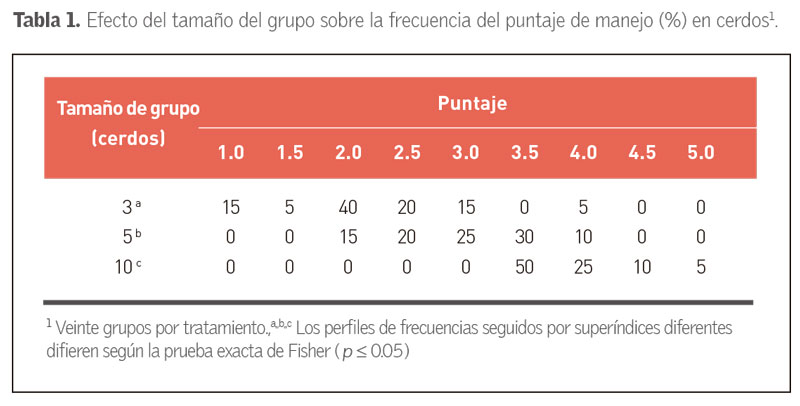 Los grupos más pequeños (3 cerdos) mostraron una mayor facilidad de manejo en comparación con los grupos más grandes (10 cerdos). Filipe Dalla Costa et al. Indican que, basado en las puntuaciones de manejo, los grupos con menos de 10 cerdos eran razonablemente más fáciles (p < 0.05) de manejar debido a la menor ocurrencia de animales que se daban la vuelta y se detenían. A medida que aumentaba el tamaño del grupo, la facilidad de manejo disminuía (tabla 1).