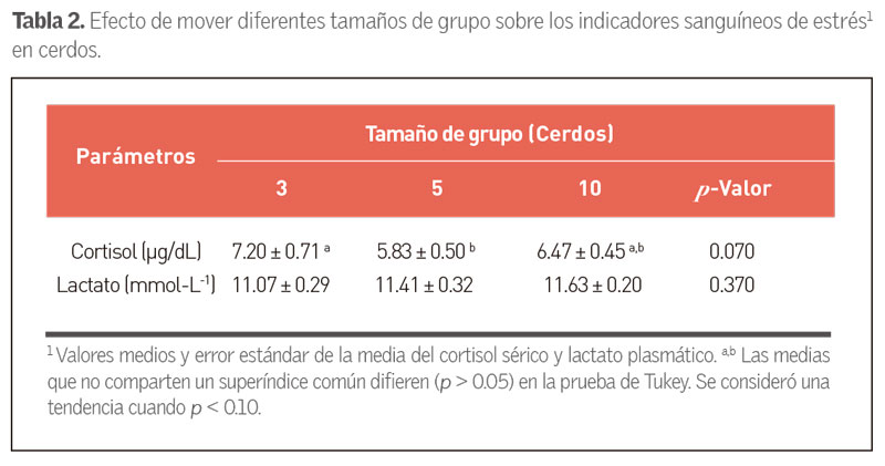 Los niveles de cortisol en sangre fueron más bajos en los cerdos manejados en grupos de cinco, lo que indica menos estrés (ver tabla 2).