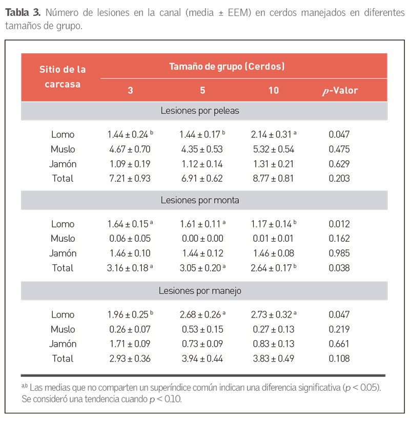 La investigación realizada por Dalla Costa et al. (2019), proporciona evidencia significativa sobre la relación entre el tamaño del grupo de cerdos y la incidencia de lesiones en la carcasa. Los resultados indican que los cerdos manejados en grupos más grandes (10 cerdos), experimentan un mayor número de lesiones en comparación con aquellos en grupos más pequeños (3 y 5 cerdos). Ver tabla 3.