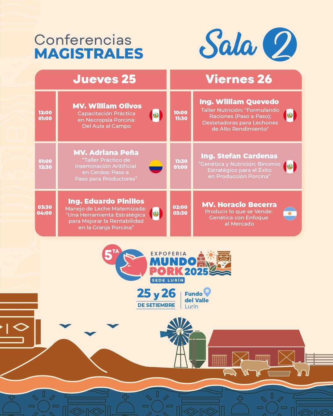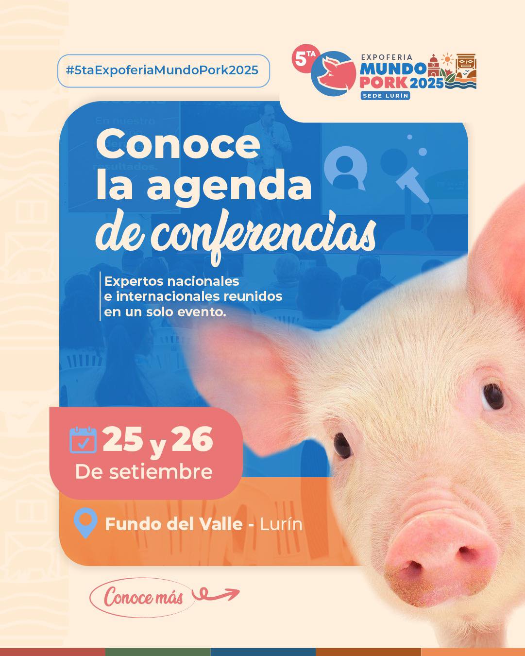 El 25 y 26 de septiembre se llevará a cabo MUNDO PORK 2025 en el Fundo del Valle, Km 32.5 de la Antigua Panamericana Sur, Lurín. El evento congregará a productores, especialistas y empresas del sector porcino, en un espacio diseñado para compartir conocimientos y fortalecer la industria.