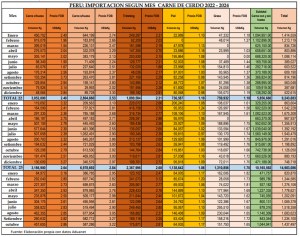 - Carne deshuesada (pulpa de cerdo): 587.3 t provenientes de Brasil, Estados Unidos y Chile, con un precio FOB de US$ 3.22 por kilo.