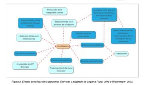 Hoy en día, los efectos benéficos de suplementar la nutrición con glutamina están bien estudiados. Se han realizado un gran número de estudios revisando la presencia de glutamina tanto en dietas animales como humanas (jóvenes y adultos), demostrando que esta tiene efectos positivos en el estatus de oxidación, la translocación bacteriana, el estatus de inmunidad, balance de nitrógeno y desarrollo muscular (Ver figura 3).