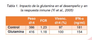 Esto confirma el rol protector de la glutamina en la integridad intestinal, proveyendo energía a los enterocitos y actuando como un mecanismo de prevención de enfermedades e infecciones. (Leguina-Ruzzi, 2015). En segundo lugar, la glutamina remueve sustancias oxidantes y promueve la activación inmune (Wang et al., 2008). Esto también es confirmado por Yi et al. (2005), donde demostraron que la suplementación con glutamina en el alimento iniciador para pollos derivaba en una mejor morfología intestinal y en una mejor respuesta inmune (Tabla 1). Se levantaron 720 pollos Cobb tanto con una dieta control de levante (4.24% gln) o con una dieta suplementada con glutamina al 1%.