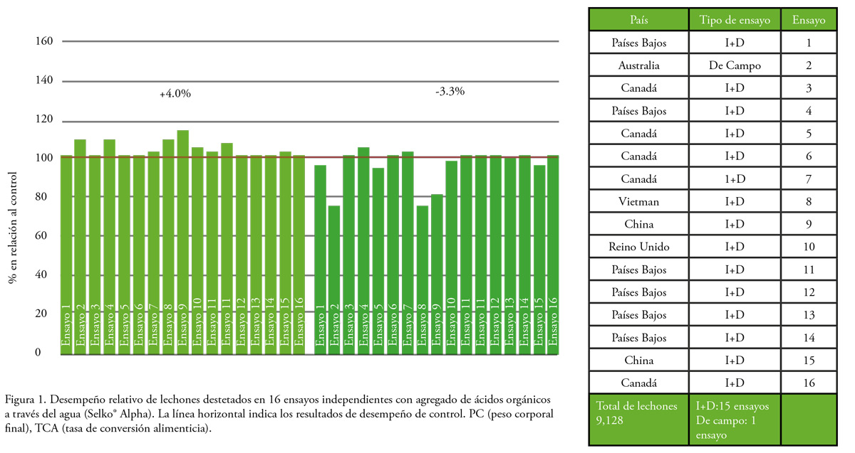 El equipo de investigación de Selko realizó 16 estudios (15 de I+D y 1 ensayo de campo) en colaboración con centros de investigación, universidades y agricultores de diferentes países, para cubrir así diferentes sistemas de producción, climas y condiciones de alojamiento. Los estudios que evaluaron los efectos de Selko® AlpHa en el desempeño de crecimiento de los cerdos recién destetados mostraron que la conversión alimenticia (CA) se redujo en un promedio de -3.3%, y el peso corporal final mejoró en un promedio de +4.0% cuando Selko® AlpHa se aplicó a través del agua (Figura 1).