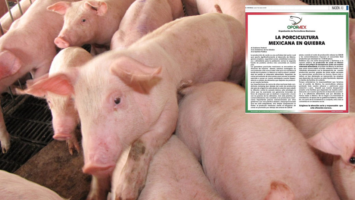 La porcicultura mexicana amaneció este lunes con un comunicado desplegado en El Universal emitido desde la Organización de Porcicultores Mexicanos (Opormex), en donde se advierte que la producción de carne de cerdo se encamina a la quiebra, próxima además, a desencadenar una crisis social.