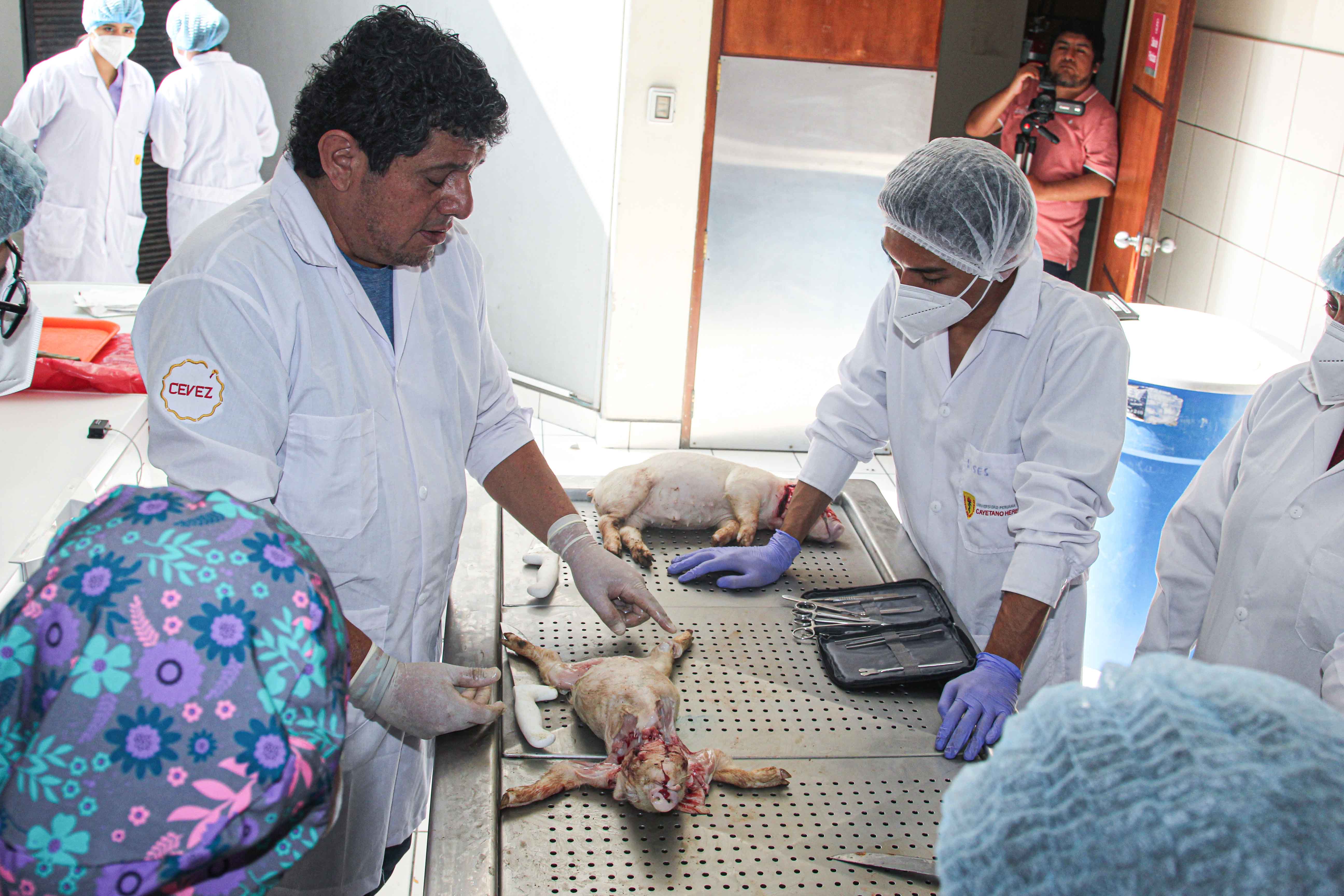 El pasado sábado 26 de abril se llevó a cabo el Taller de Necropsia en Cerdos, una actividad académica organizada por la Facultad de Medicina Veterinaria y Zootecnia de la Universidad Peruana Cayetano Heredia (UPCH). El taller fue dirigido por el médico veterinario Williams Olivos, representante de la empresa veterinaria AV Products, y contó con la participación activa de los estudiantes de esta facultad.