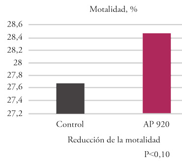 Los cerdos positivos al PRRS alimentados con plasma AP920 tuvieron una menor mortalidad (21 de 480 cerdos) en comparación con la dieta del grupo de control que no contenía plasma AP920 (35 de 480 cerdos). Al final de la prueba, las tasas de mortalidad eran un 40% más bajas para los cerdos alimentados con dietas que contenían plasma AP920.